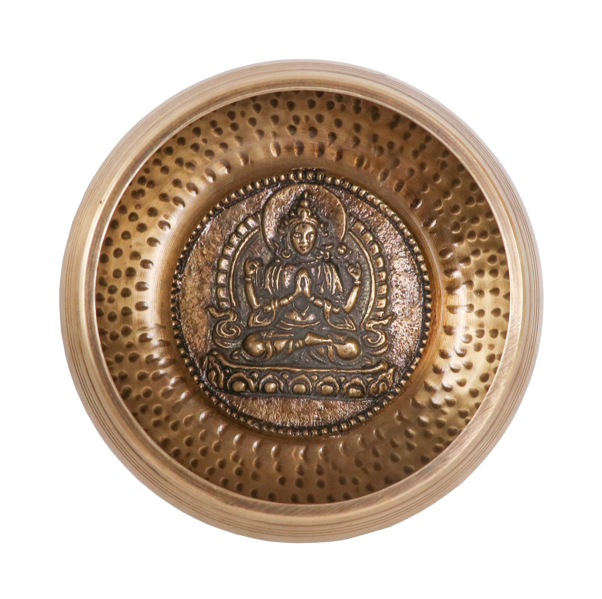 Buddha Metal Singing Bowl Brass Chyangrasi Set is made in traditional way. It takes a lot of effort to finish this singing bowl. All the special arts are refined by (only) expert artisans. The Singing Bowl is shaped by beating the bowl with a hammer. This singing bowl can be custom hammered and engraved with attractive Arts, Designs, Decorations and Dice inside the bowl (Example: Bajra, 'Om Mani Padme Hum', Four Buddha Dice, and so on).
