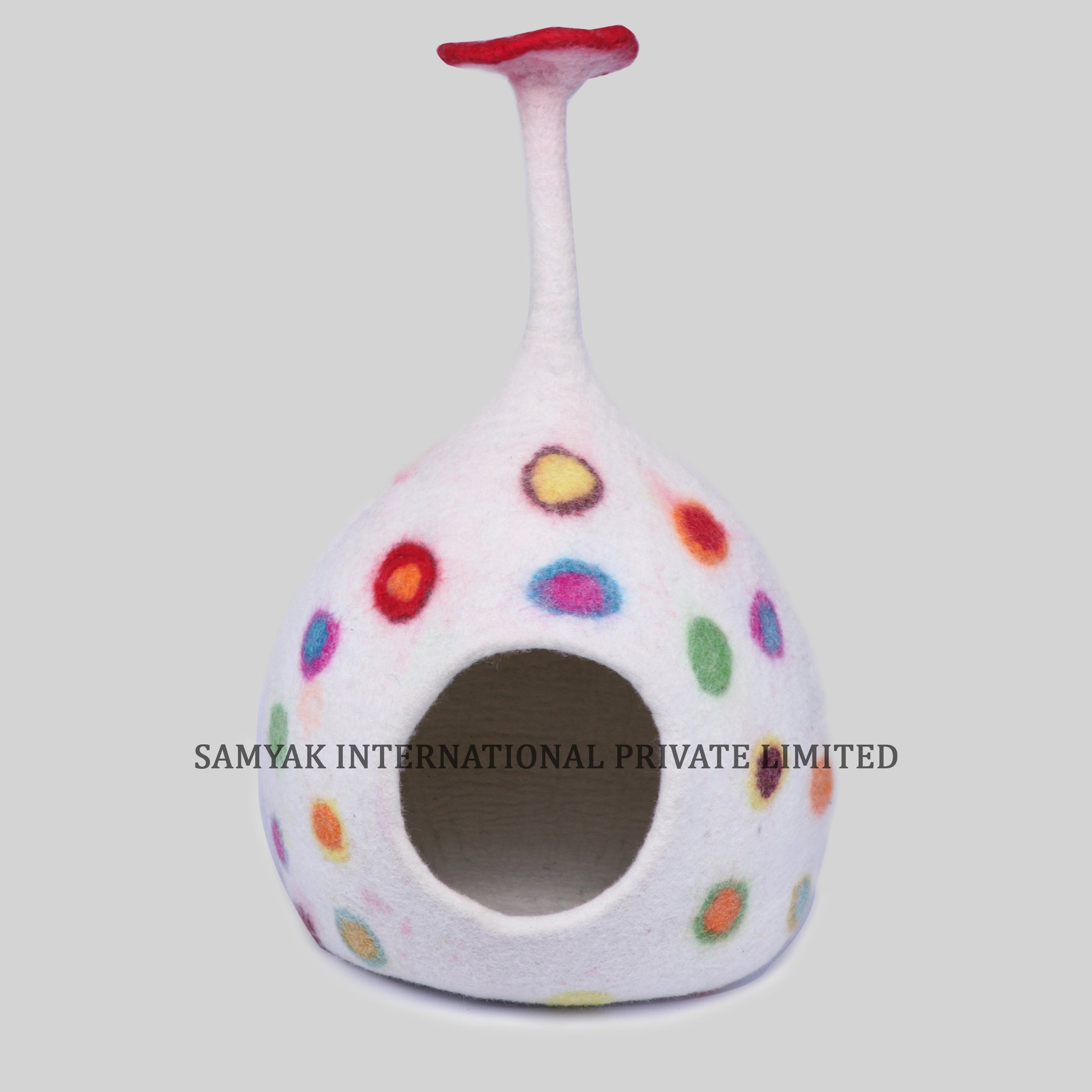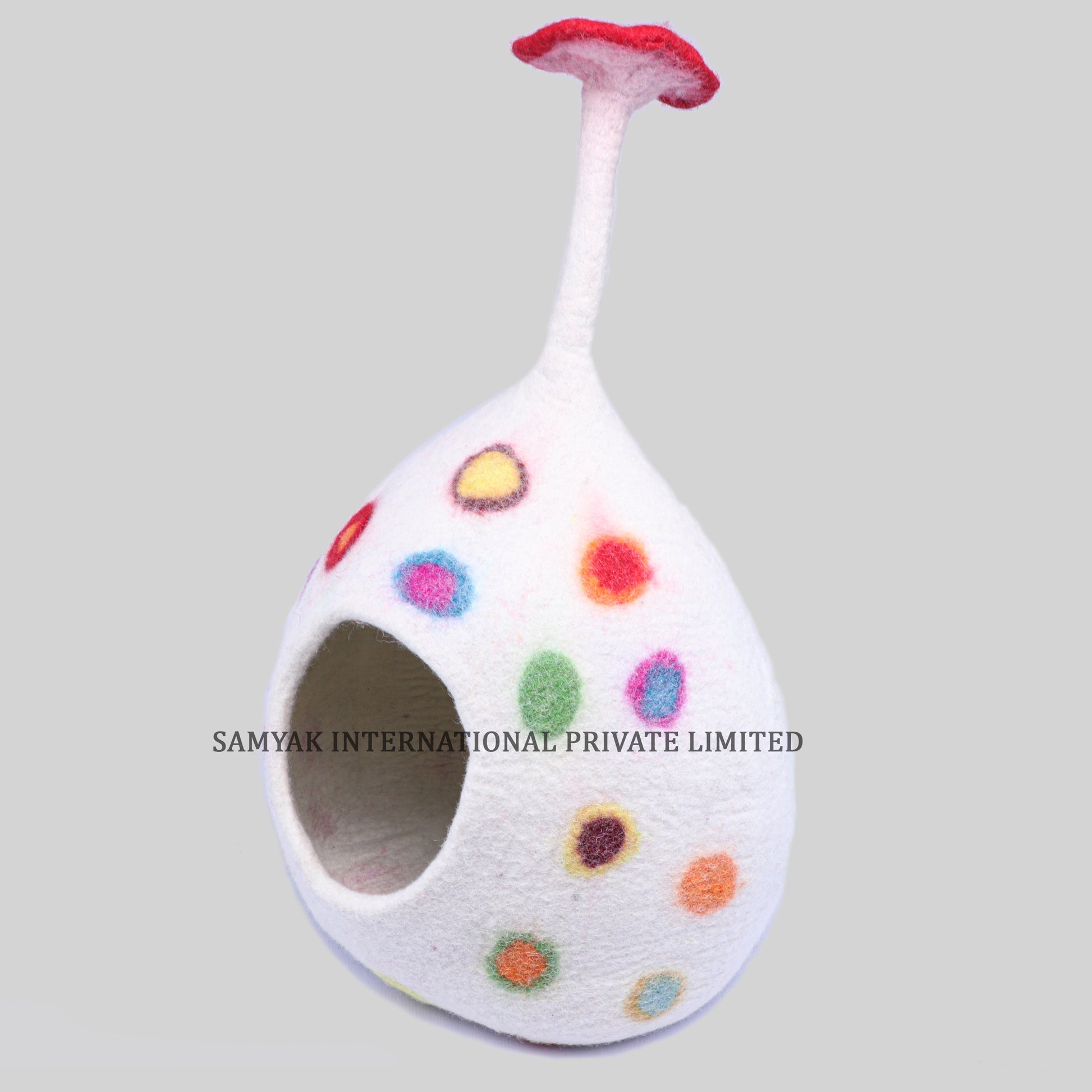 These felted cat caves are easy to clean. Use soap and water to wash them, but gently. Remember to restore their shape before drying. You can also brush with soft brush or use vacuum cleaner.