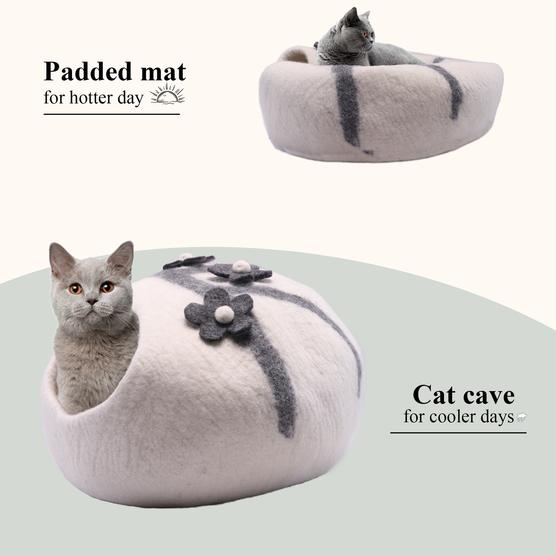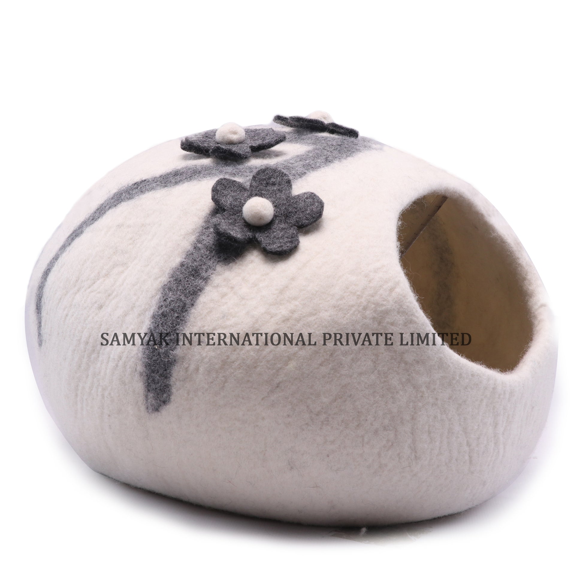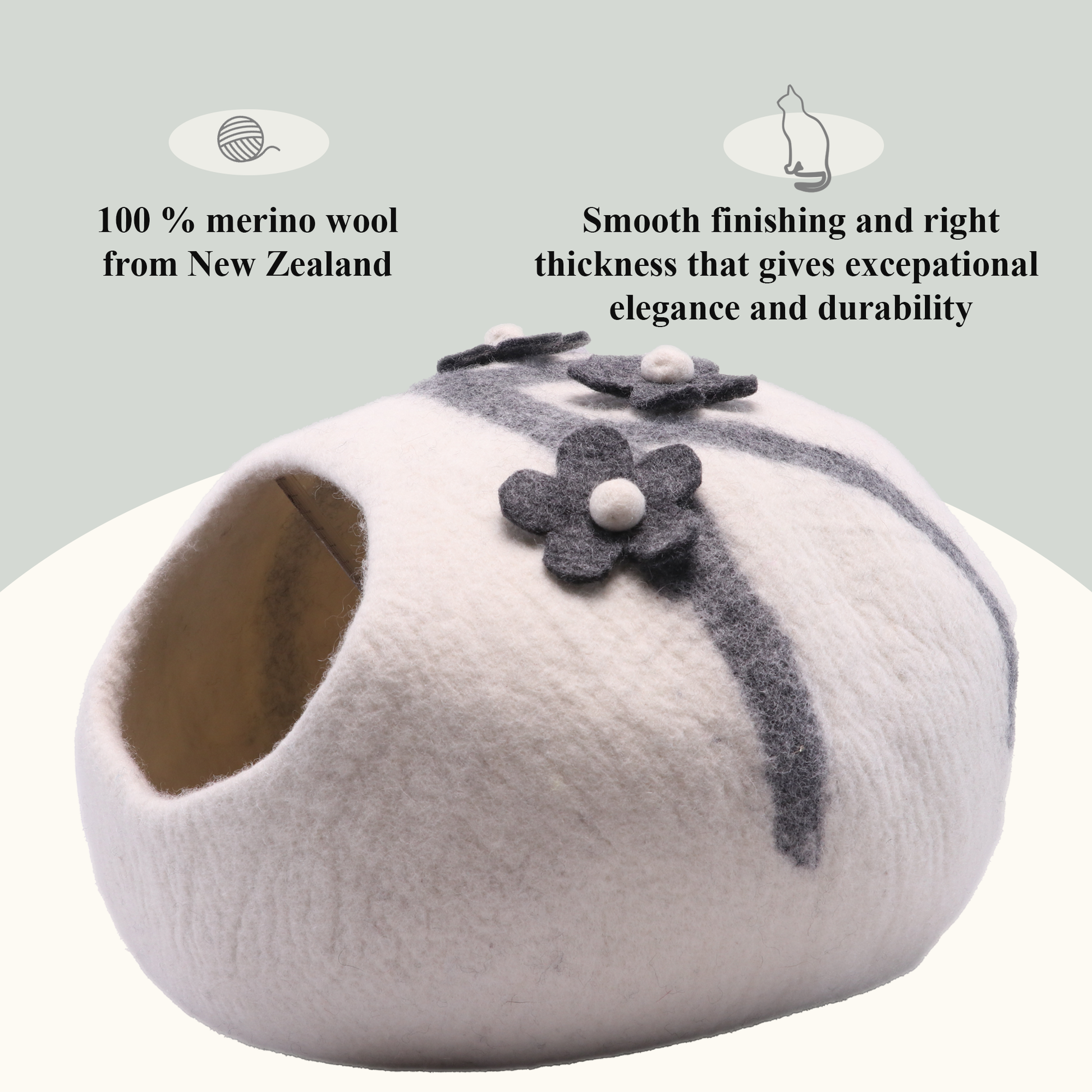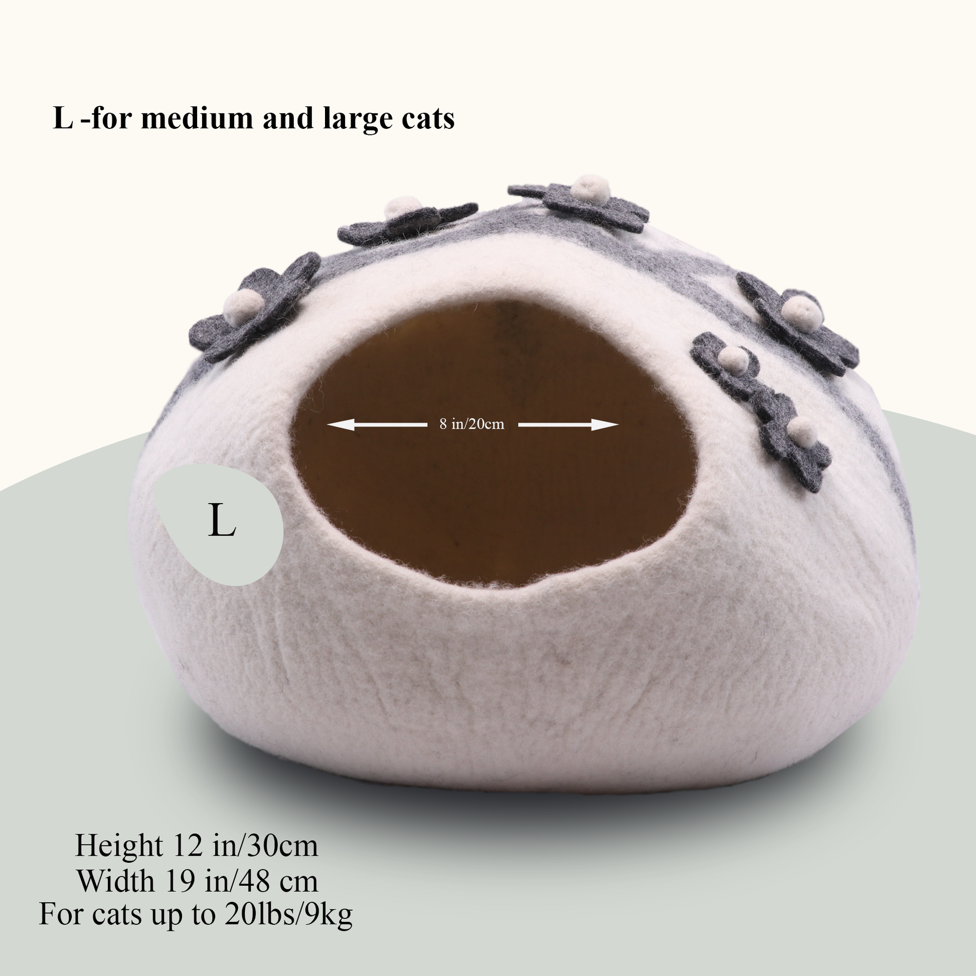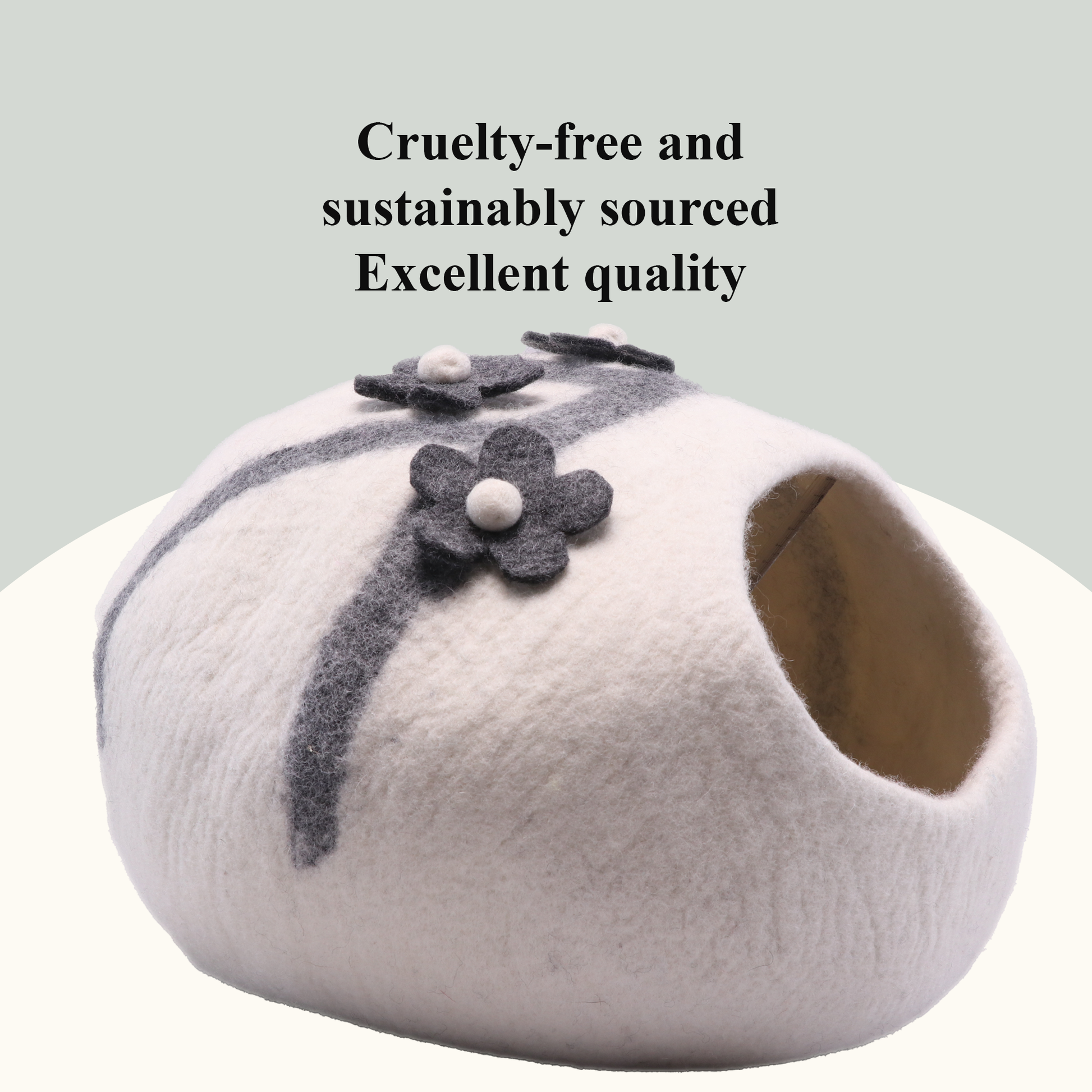 These felted cat caves are easy to clean. Use soap and water to wash them, but gently. Remember to restore their shape before drying. You can also brush with soft brush or use vacuum cleaner.