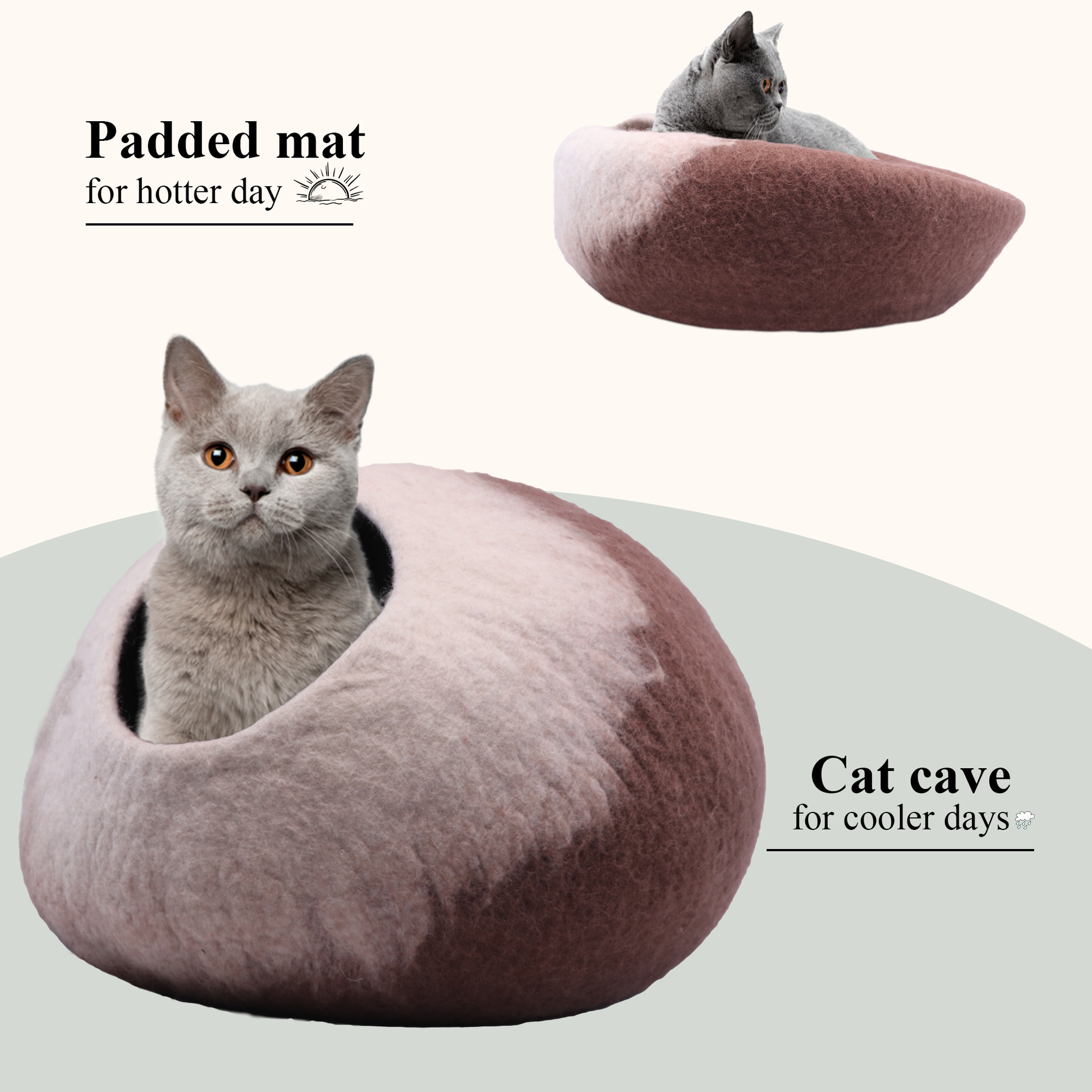 These felted cat caves are easy to clean. Use soap and water to wash them, but gently. Remember to restore their shape before drying. You can also brush with soft brush or use vacuum cleaner.
