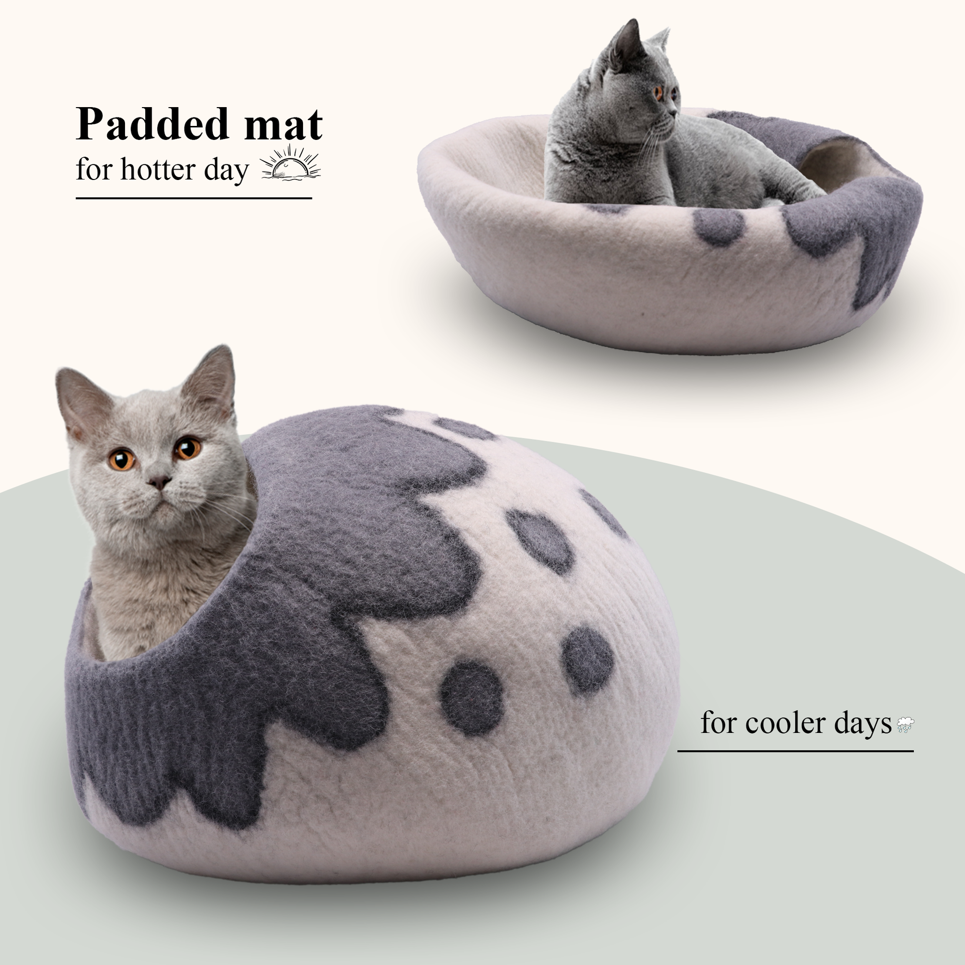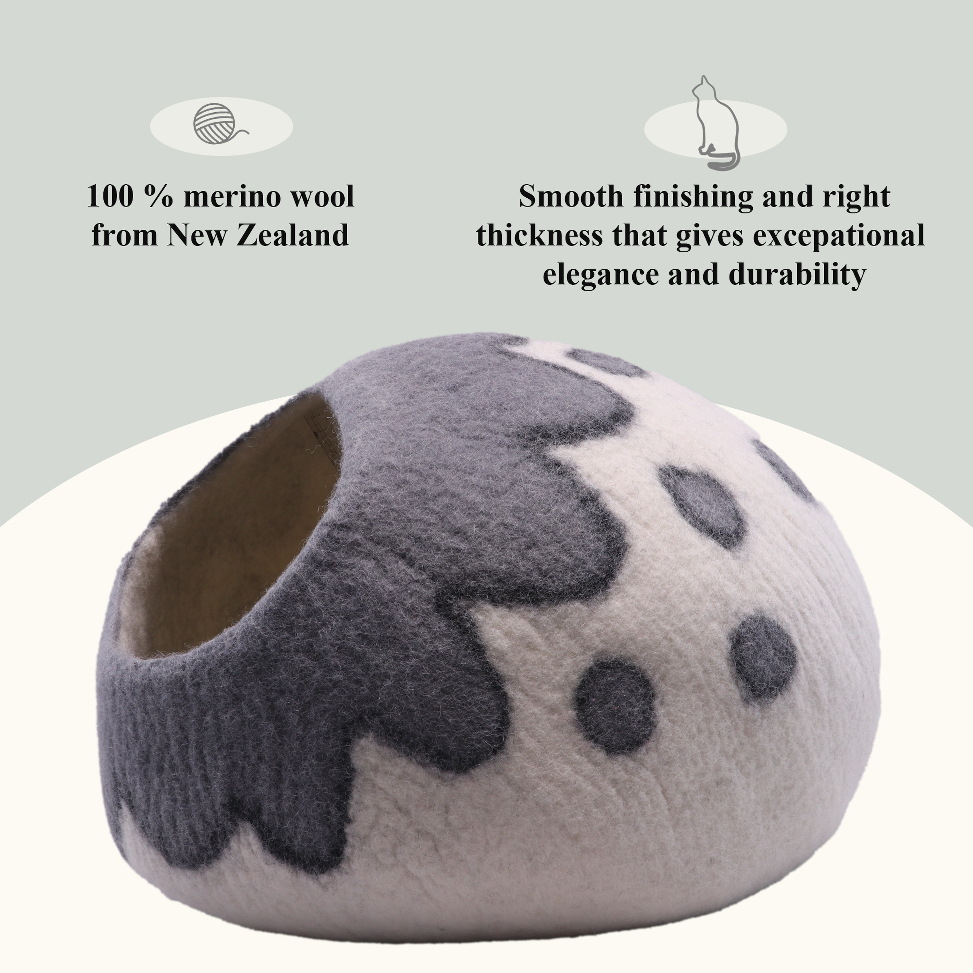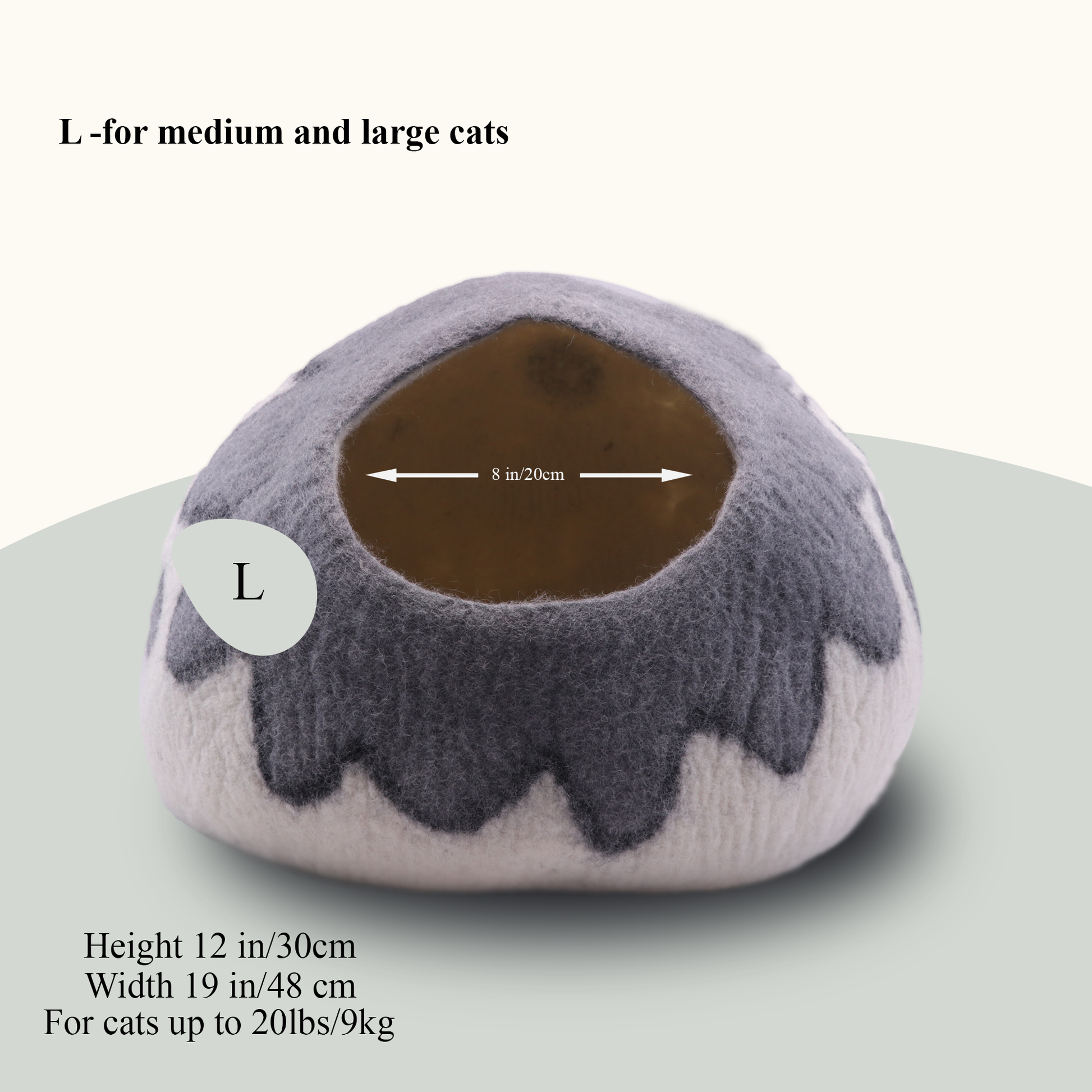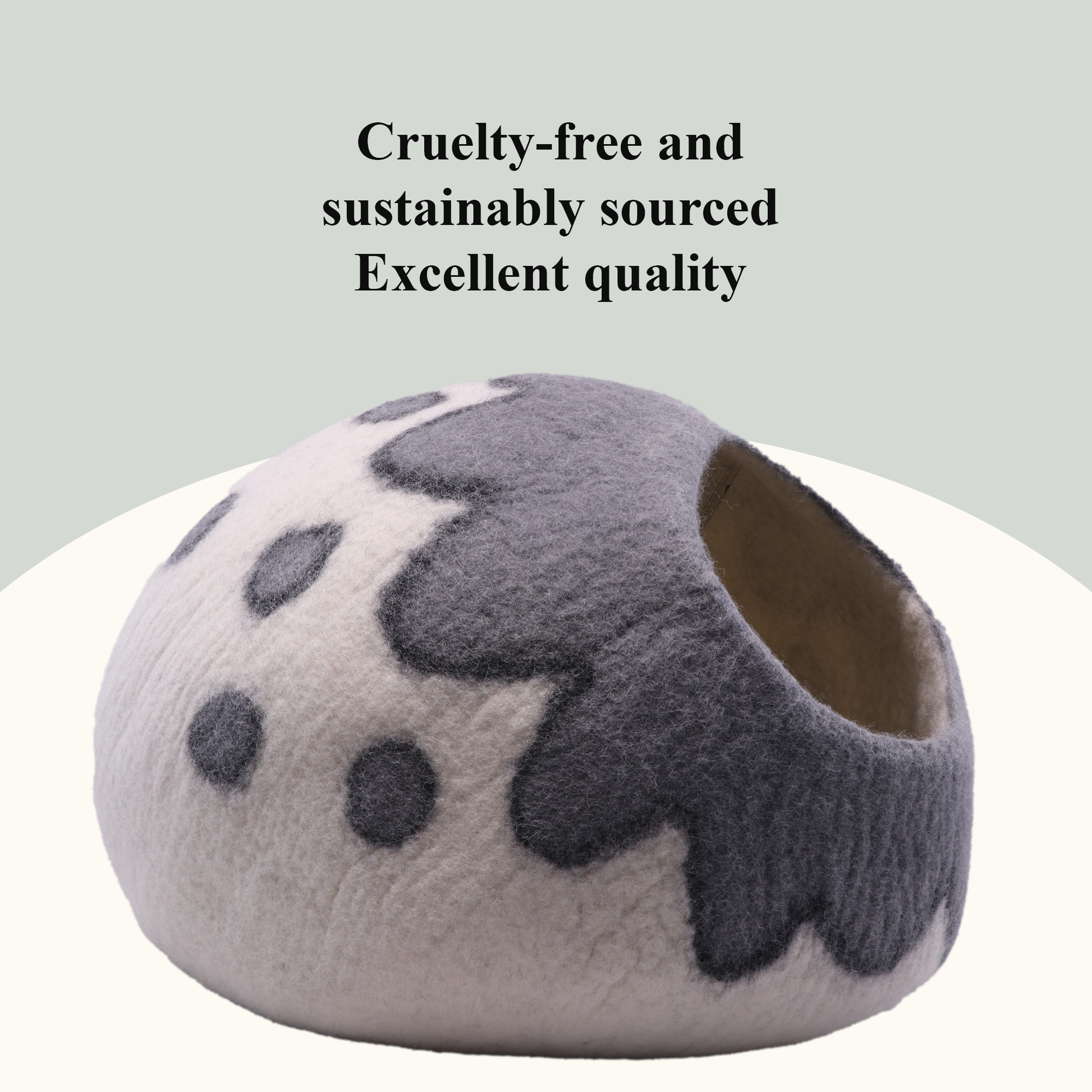 These felted cat caves are easy to clean. Use soap and water to wash them, but gently. Remember to restore their shape before drying. You can also brush with soft brush or use vacuum cleaner.