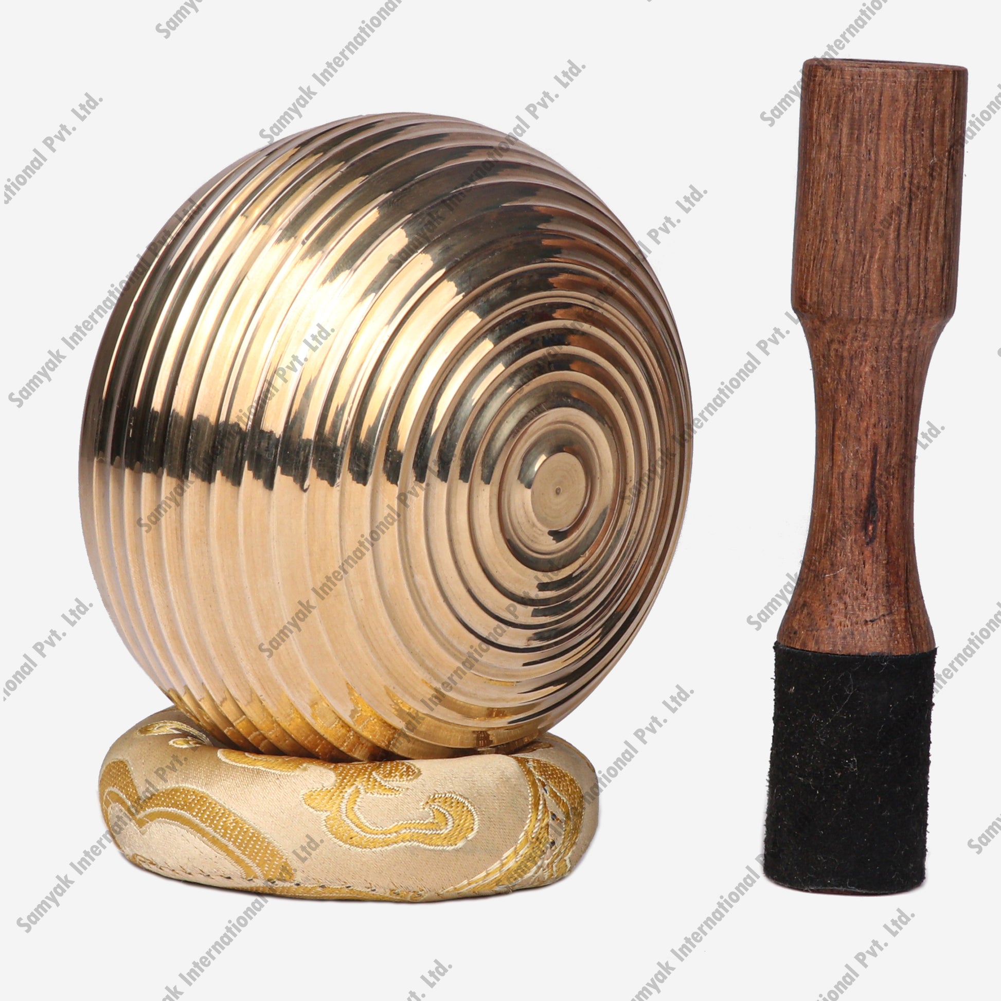 Decorated bowls are hand engraved inside with varieties of antique, simple and beautiful arts, designs, or mantras (Tibetan mantra of compassion, Om Mani Padme Hum) by our Nepalese expert craftsmen and crafts women. They can be found outside the rim, inside the bottom, around the top of the rim and sometimes on the outside bottom of the bowl. This one is a spiral Singing Bowl.
